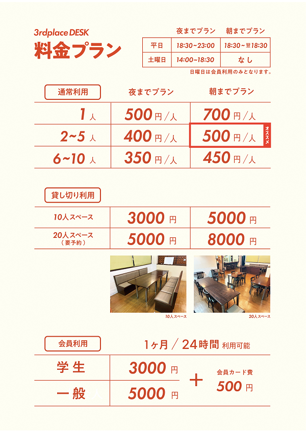 ※そのほか、グループ割引や貸し切りプランなどを用意。詳細や最新の情報については『3rdplace DESK』のホームページ、Instagram、をご覧ください!