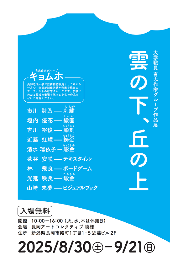 長岡造形大学で教務補助職員として勤める一方で制作活動を続けるアーティストの有志作家グループ『キョムホ』が作品展&ワークショップを開催します。