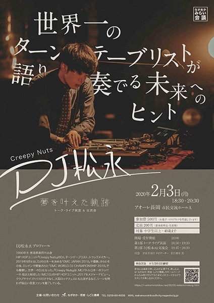 長岡市出身で「DMC WORLD DJ CHAMPIONSHIP 2019」で優勝し、世界一のDJとなったCreepy NutsのDJ松永さんが自身の夢を叶えた軌跡を語りました。
