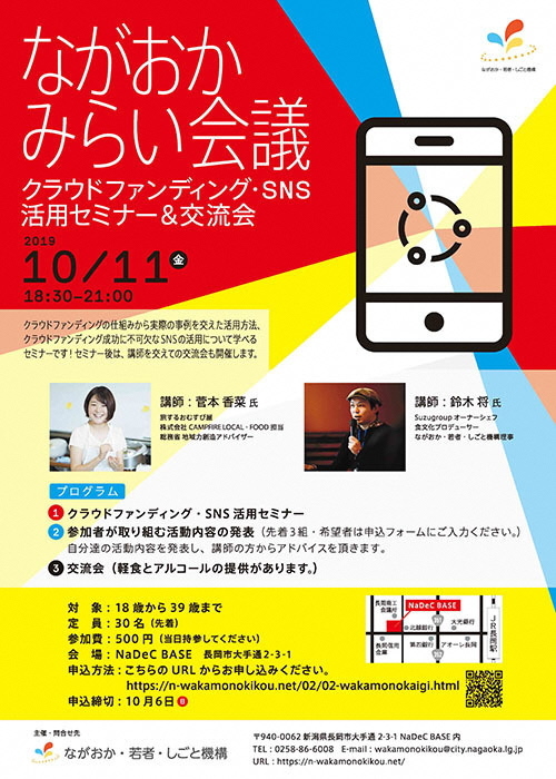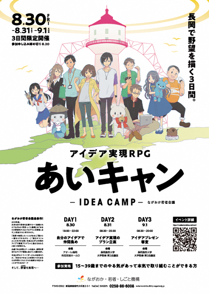 『あいキャン』は、アイデア実現に向けたプランを立て、実際に動き出すための自信をつけるイベント。主役は参加者一人ひとり。最終日にはながおか・若者・しごと機構の若者提案プロジェクトを担当する理事がアイデアを審査。優秀なアイデアは補助事業として採択し、実現に必要な資金補助等のサポートを行いました。