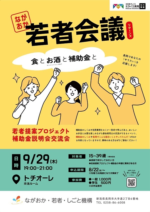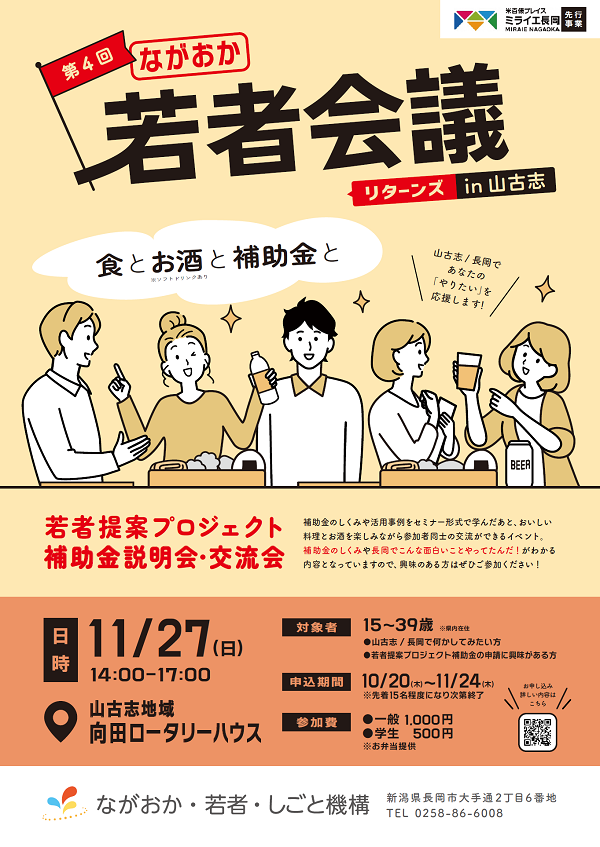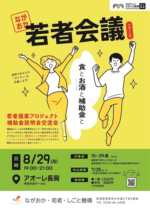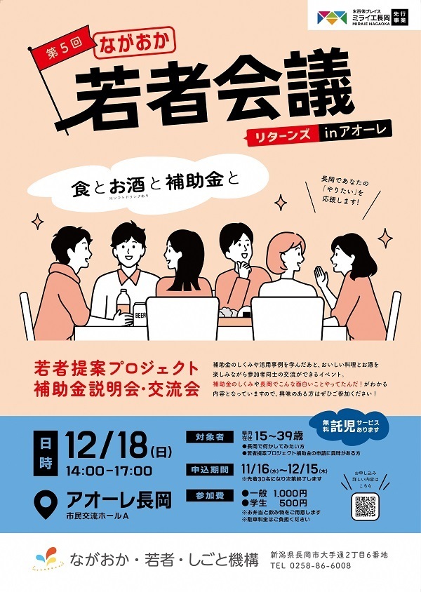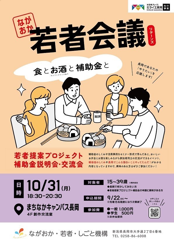 補助金のこと、「知りたい!」「使いたい!」「わからない!」み~んなまとめて、ながおか・若者・しごと機構の理事が「ながおか若者会議」で解決します!!
