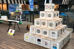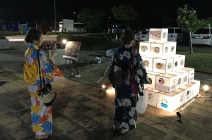 30cm四方の正方体の行灯(木枠に和紙貼付け)に、新潟大学教育学部附属長岡小・中学校の児童・生徒が描いた長岡にちなんだイラストを貼り付けたものを55個制作し、ピラミッド型に積み上げて展示しました。