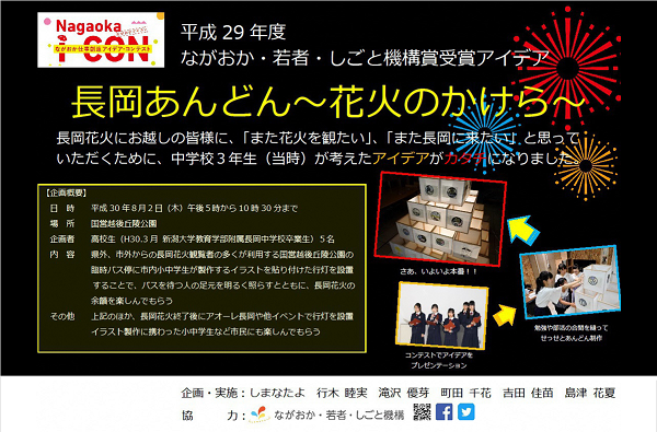 平成29年度ながおか仕事創造アイデア・コンテスト「いいね!アイデア部門」でながおか・若者・しごと機構賞を受賞した、新潟大学教育学部附属長岡中学校3年生(当時)5名のアイデアが実現しました。