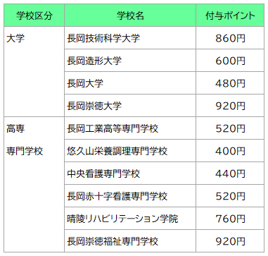 在籍する学校の最寄りのバス停から長岡駅までの往復のバス代相当をながおかペイのポイントとして付与します。