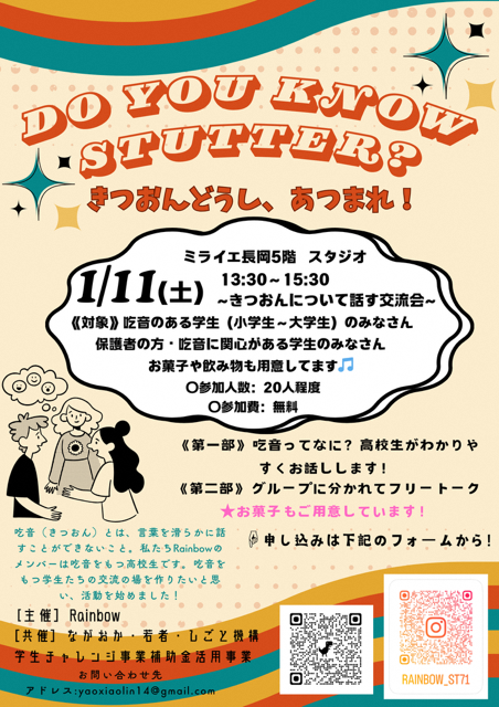 吃音(きつおん・言葉を滑らかに話すことができないこと)について、当事者の高校生が分かりやすくお話するほか、参加者同士で交流会を行います。吃音に関心がある学生さんも大歓迎です。