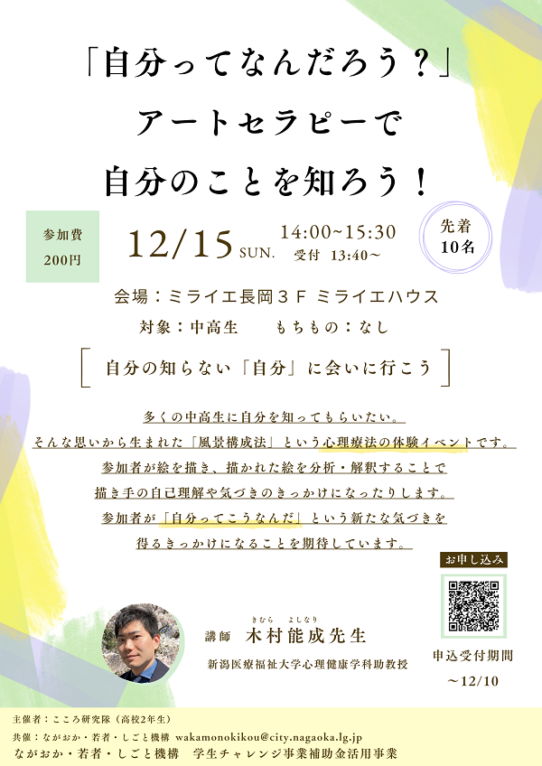 自分の描いた絵を分析することで自己理解を深める「風景構成法」というアートセラピーの講座を高校生が企画し、開催します。自分の描いた絵で自分の心の中を知ってみませんか。