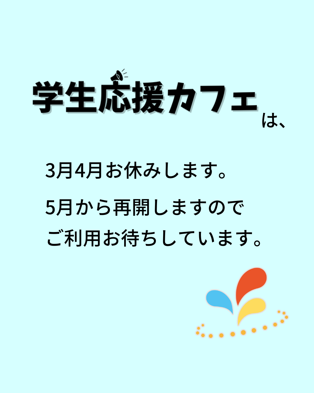 3月、4月の2か月間学生応援カフェをお休みし、5月から再開します。
