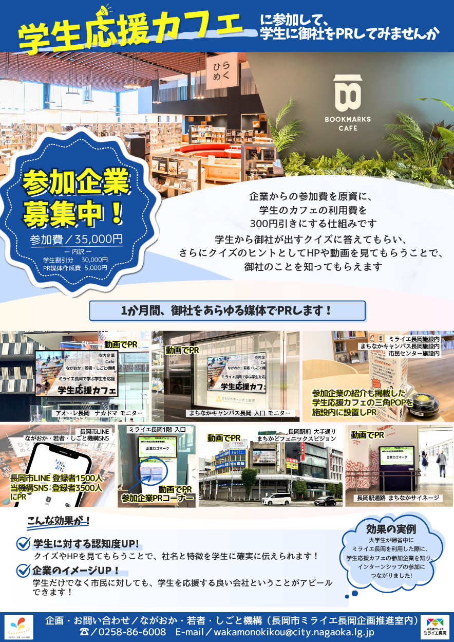 学生応援カフェ参加企業募集中! 学生応援カフェに参加して、学生に御社をPRしてみませんか? 学生応援カフェ参加企業募集チラシ 詳細は、ながおか・若者・しごと機構(TEL/0258-86-6008 E-mail/wakamonokikou@city.nagaoka.lg.jp)まで、お問い合わせください。