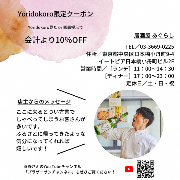 ビジネス街として賑わう日本橋。都心にありながらもまるで田舎に帰って来たかのような温かい雰囲気があふれる居酒屋です。