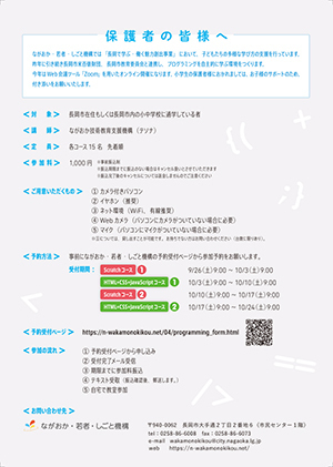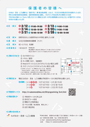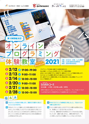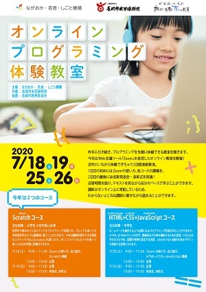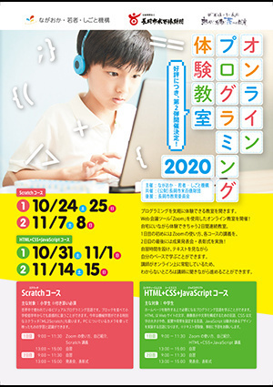 昨年にひきつづき、プログラミングを気軽に体験できる教室を開きました。令和2年はWeb会議ツール「Zoom」を使用したオンライン教室を開催!自宅にいながら体験できちゃう2日間連続教室。1日目のはじめにはZoomの使い方、各コースの講義を、2日目の最後には成果発表会・表彰式を実施!自習時間を設け、テキストを見ながら自分のペースで学ぶことができました。講師がオンライン上に常駐しているため、わからないところは講師に聞きながら進めました。