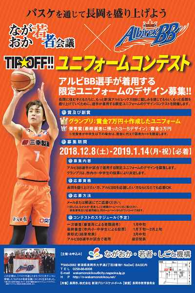 平成30年6月から9月にかけて開催した「ながおか若者会議」(※)で提案された「Tip-off!!ユニフォームコンテスト」を開催!