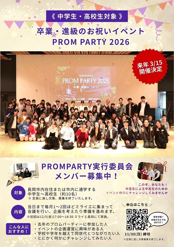 今年度も3月15日(日)に、中高生の卒業・進級を祝うPROM PARTYの開催が決定!
